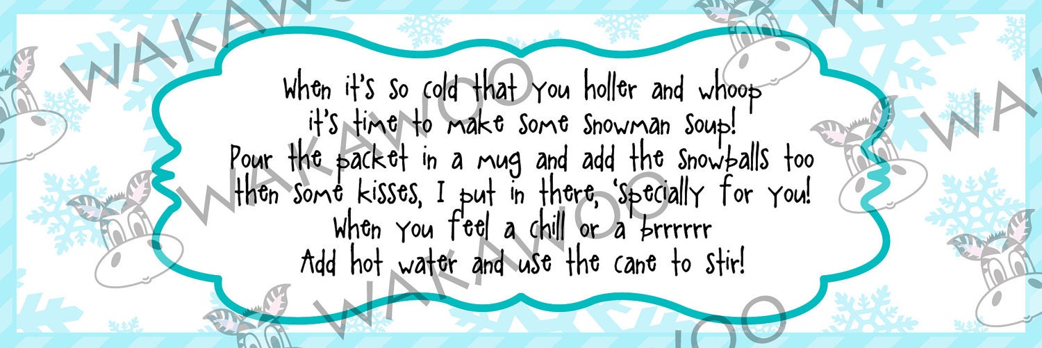 FREE Snowman Soup Poem Printable - Davonne Parks Snowman soup poem (Free printable here !) Instructions Place 1/4 cup hot chocolate mix into a sandwich size zip-top bag Add about three hershey's kisses (still in wrappers) Include around a dozen miniature marshmallows Place a candy cane on top (still in wrapper) Seal bag Staple or tape snowman soup poem to top of bag Making the snowman soup: Snowman Soup Labels + Tags - Free Printables | A Fun ... Snowman Soup You can print this photo and use it as a label for your Snowman Soup. Here's a really neat ideal that people really seem to love and I'm sure your kids or grand kids will love it to. Its a fun holiday ideal called Snowman Soup. I know a lot of the... N Nancy Seyer Amelunke Books Worth Reading Christmas Activities Holiday Crafts