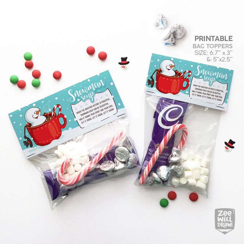Christmas: Snowman Soup Printable Bag Topper - See Vanessa Craft Step 1: Print out the Free Printable Bag Toppers on white card stock paper. Cut out the bag toppers and fold in half. Cut out the bag toppers and fold in half. Step 2: Place a hot cocoa packet, candy cane and 10 miniature marshmallows in a quart sized bag.