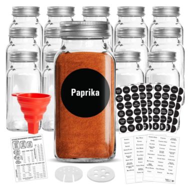 Talented Kitchen 14 Large Glass Spice Jars w/2 Types of Preprinted Spice Labels. Commercial Grade, Complete Set 14 Square Empty Jars 6oz, Pour/Sift & ...